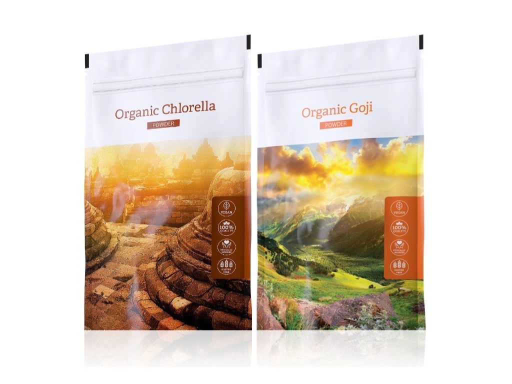 Doplněk stravy. Kombinace zelených potravin Taiwan Chlorella powder a Organic Goji powder se slevou.
