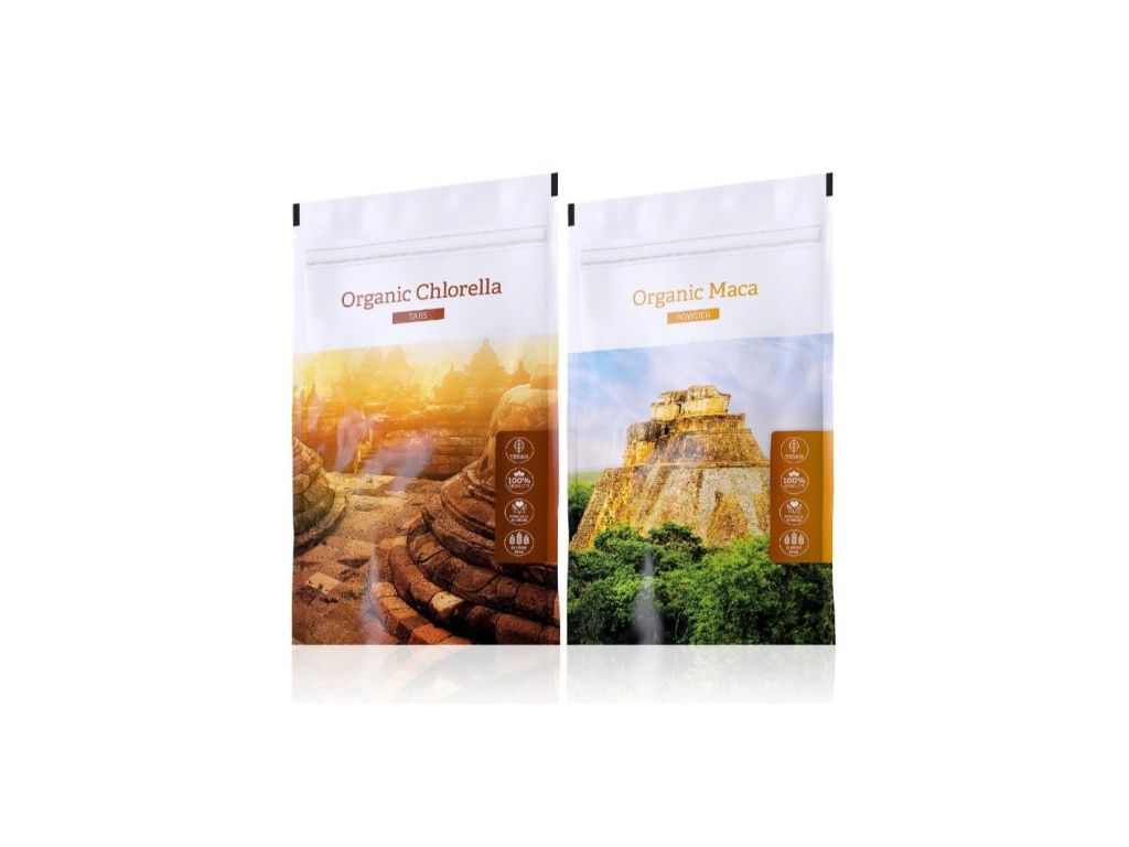 Doplněk stravy. Kombinace zelených potravin Organic Chlorella tabs a Organic Maca caps se slevou.