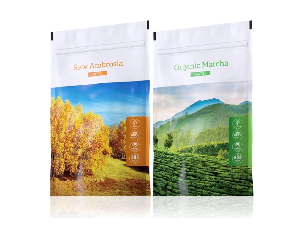 Doplněk stravy. Kombinace dvou zelených potravin Raw Ambrosia pieces a Organic Matcha powder se slevou 272 Kč.