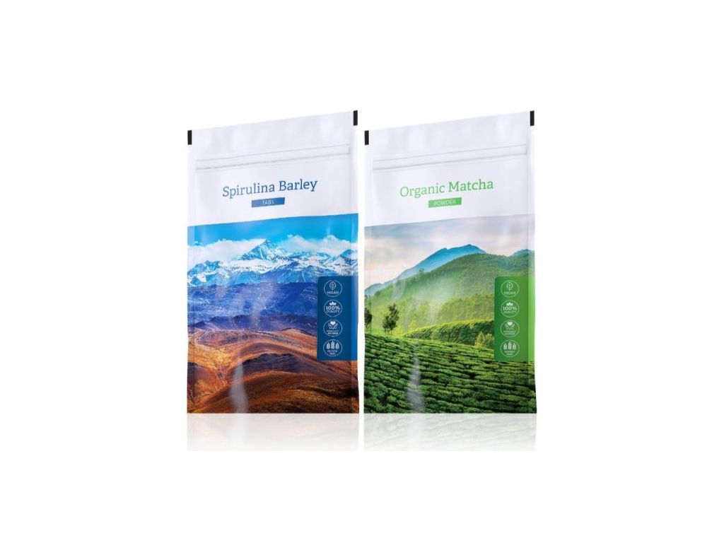 Doplněk stravy. Kombinace zelených potravin Spirulina Barley tabs a Organic Matcha powder se slevou 165 Kč.